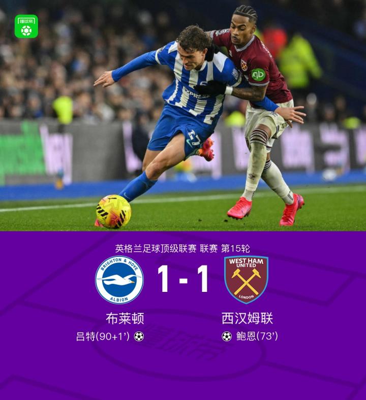 布莱顿1-1西汉姆,鲍恩小角度倒地破门,吕特扳平比分