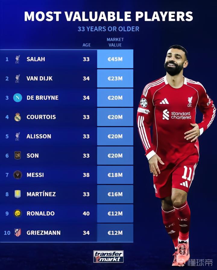 1. 萨拉赫(利物浦) 33岁 4500万欧元
