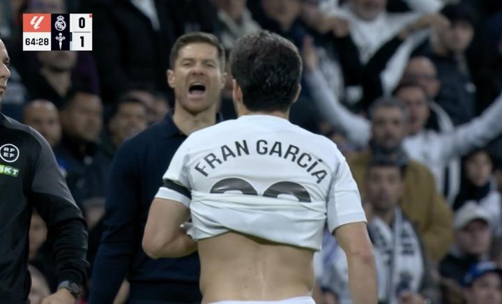 此役主场对阵塞尔塔,首发出战的弗兰-加西亚在比赛第63分钟和第64分钟连续因犯规领到黄牌,两黄变一红被罚下,这导致0-1落后的皇马被迫少一人作战。