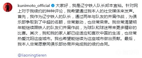 邦本宜裕写道:“大家好,我是辽宁铁人队长邦本宜裕。针对网上对于我续约的种种评论,我希望通过我本人的社交媒体来发声。首先,我作为辽宁铁人的队长,通过两年与队友的并肩作战,为俱乐部争取到了中超的名额,非常激动,也非常荣幸。我非常渴望明年能继续跟铁人的队友们并肩作战,为球队和球迷带来更多精彩的比赛。其次,我和我的家人都已经适应和喜欢中国的生活,也非常热爱沈阳这座城市。我也希望能继续为这座城市做出贡献。最后,我本人非常愿意同俱乐部协商并完成我的续约合同。”
