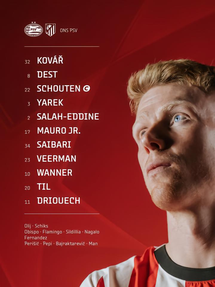 埃因霍温首发:32-科瓦日、8-德斯特、22-斯豪滕、3-贡肖罗夫斯基、2-萨拉赫-埃丁、34-萨伊瓦里、17-毛罗-儒尼奥尔、23-费尔曼、10-保罗-万纳、20-蒂尔、11-德里乌赫