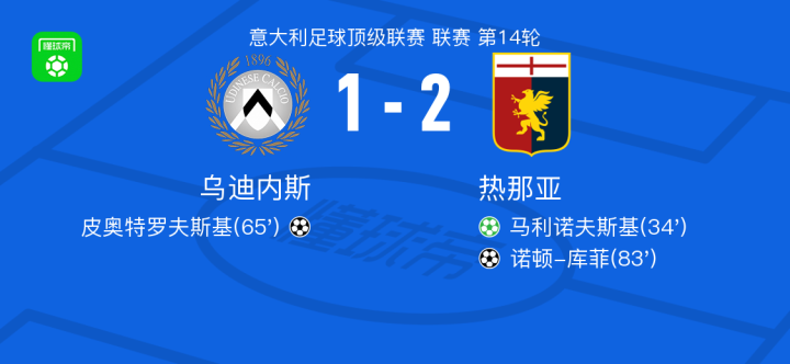 热那亚2-1乌迪内斯,诺顿-库菲、马利诺夫斯基点射破门