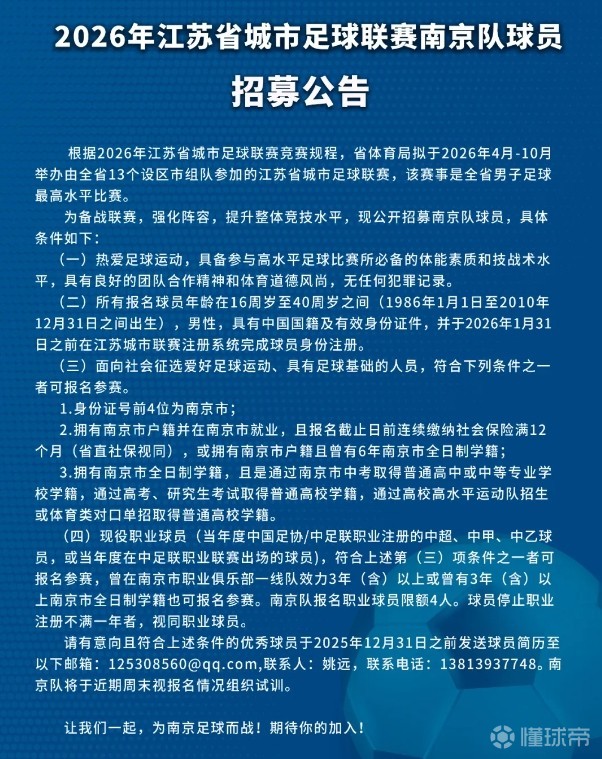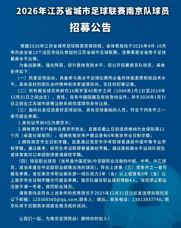 请有意向且符合上述条件的优秀球员于2025年12月31日之前发送球员简历至以下邮箱:125308560@qq.com,联系人:姚远,联系电话:13813937748。南京队将于近期周末视报名情况组织试训。
