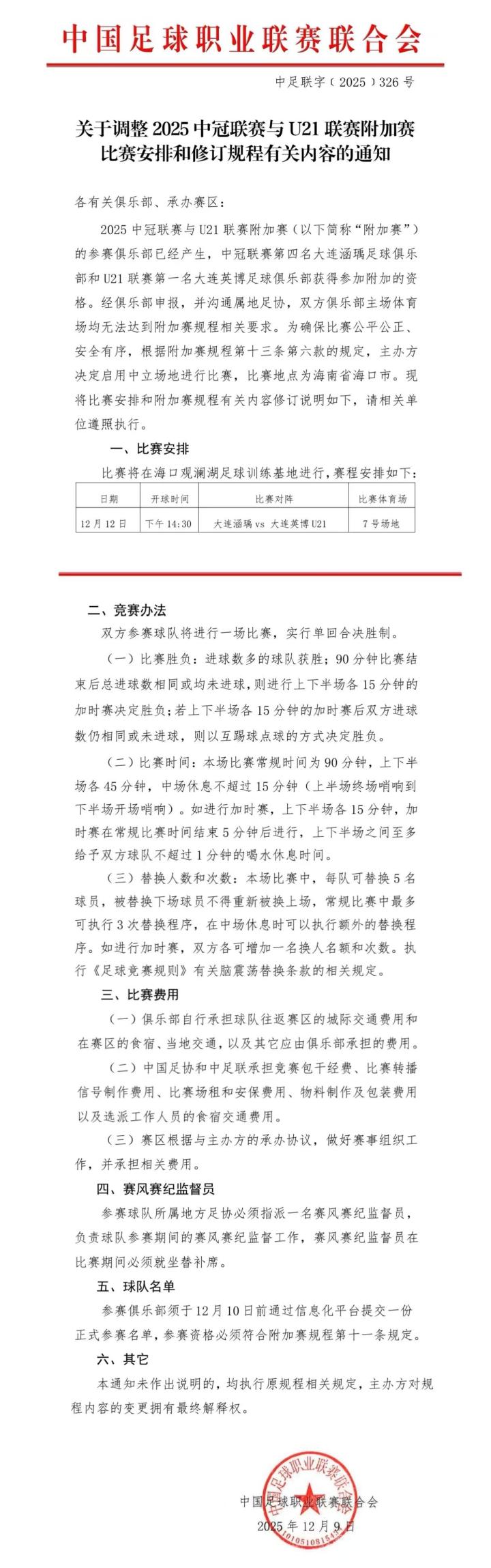 2025中冠联赛与U21联赛附加赛(以下简称“附加赛”)的参赛俱乐部已经产生,中冠联赛第四名大连涵瑀足球俱乐部和U21联赛第一名大连英博足球俱乐部获得参加附加的资格。经俱乐部申报,并沟通属地足协,双方俱乐部主场体育场均无法达到附加赛规程相关要求。为确保比赛公平公正、安全有序,根据附加赛规程第十三条第六款的规定,主办方决定启用中立场地进行比赛,比赛地点为海南省海口市。现将比赛安排和附加赛规程有关内容修订说明如下,请相关单位遵照执行。