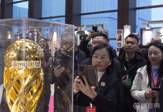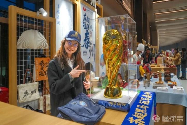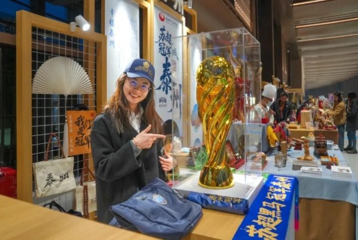 该报道表示,作为江苏足球的最高荣誉象征,这座金光灿灿的冠军奖杯继11月亮相上海进博会后,开启了第二次 “出差之旅”,一亮相就成为展会“顶流”。印着“‘苏超’黑马冠军泰州”的条幅、琳琅满目的“苏超”文创产品,让泰州展台充满冠军氛围。