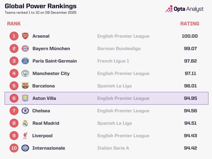 北京时间12月9日,知名数据机构Opta列出了全球范围内目前实力排名前10的俱乐部,阿森纳、拜仁慕尼黑以及巴黎圣日耳曼位列前三,上周末绝杀枪手的阿斯顿维拉位居第6。