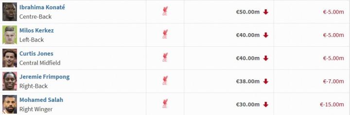 萨拉赫的身价较上期下跌了1500万欧元,和麦卡利斯特并列为跌幅第二高的利物浦球员。而伊萨克、维尔茨的身价均较上期下跌2000万欧元。
