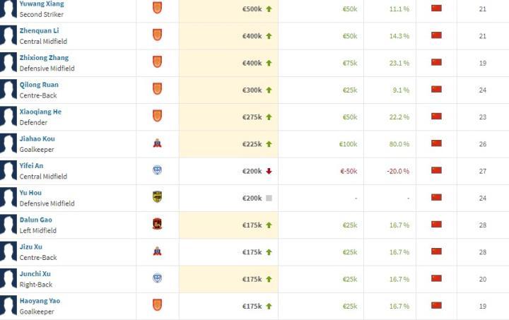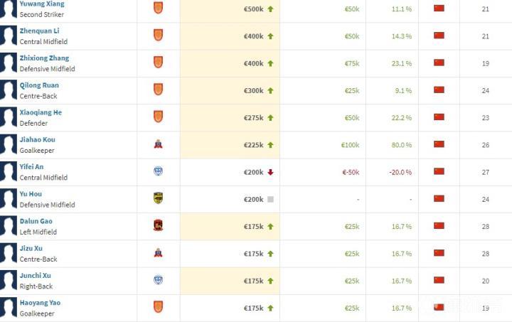 9.姚浩洋 重庆铜梁龙 17.5万欧