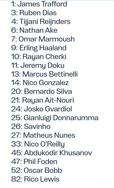前锋:7-马尔穆什、9-哈兰德、11-多库、26-萨维尼奥、47-福登、52-奥斯卡-鲍勃