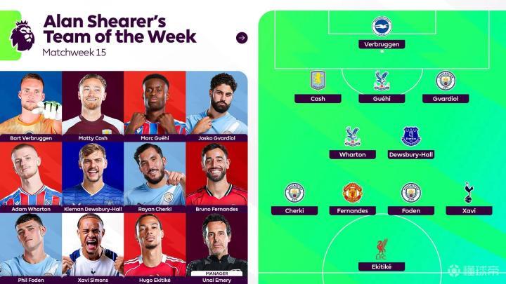 英超官方发布了阿兰-希勒评选的英超第15轮最佳阵容,埃基蒂克、福登、布鲁诺-费尔南德斯、哈维-西蒙斯等人在列。