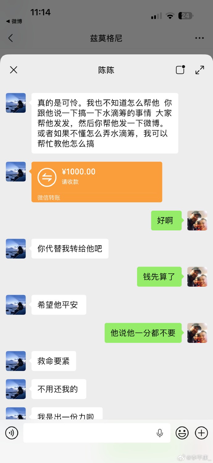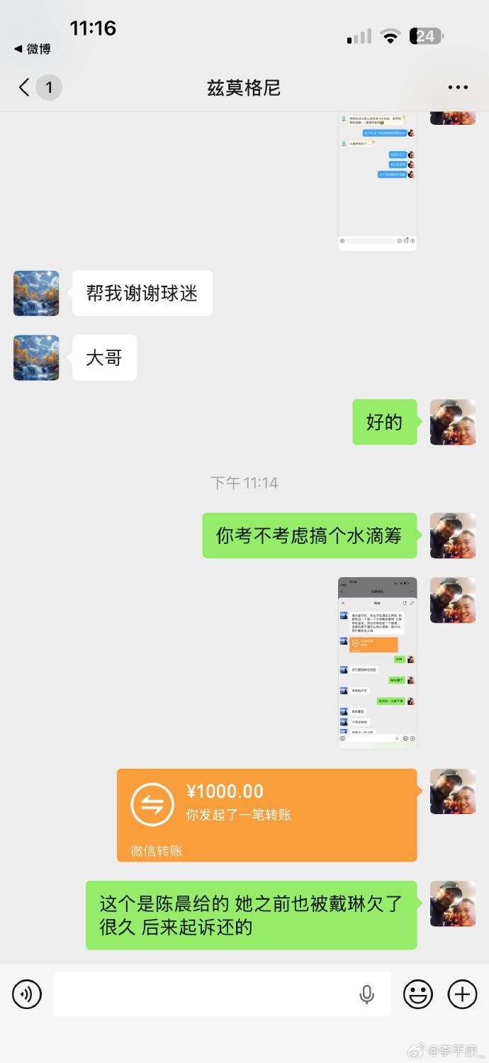 李平康写道:截止目前戴琳手机转入语音留言模式,躲避外界联系。其实应该和球迷猜测的一样,他或许惦记着债权人早点因病不治就好不用还钱。另外两年前向戴琳讨债成功的陈晨(就是热搜的那位陈晨)看到这位泰山球迷的遭遇后主动联系我,对于这个球迷的遭遇深感同情,愿意提供帮助联系水滴筹,还托我一定转1000元表示慰问。只不过这个球迷现在情况不容乐观,暂时还没有恢复清醒,无法回复我,希望他能挺过这一关,也希望戴琳还能做个人,把别人的救命钱早点还了!