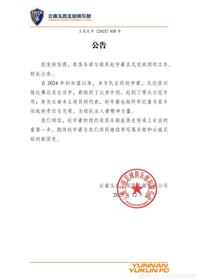 我们相信,赵宇豪的续约是俱乐部在历史传承上走出的重要一步,期待赵宇豪与我们共同继续书写俱乐部和云南足球的新历史。