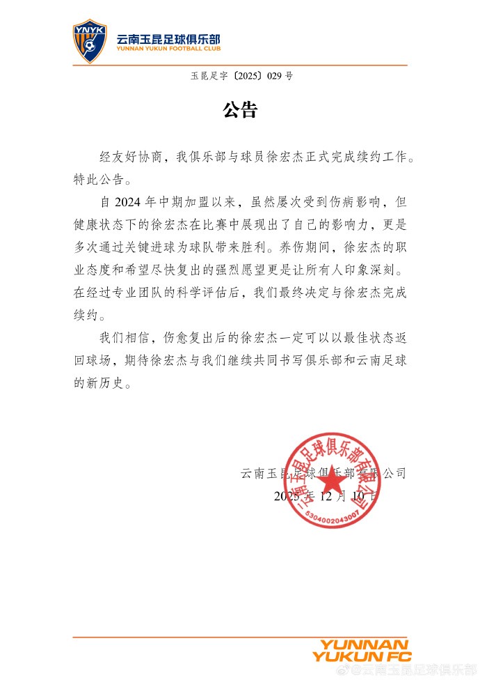 经友好协商,我俱乐部与球员徐宏杰正式完成续约工作。特此公告。