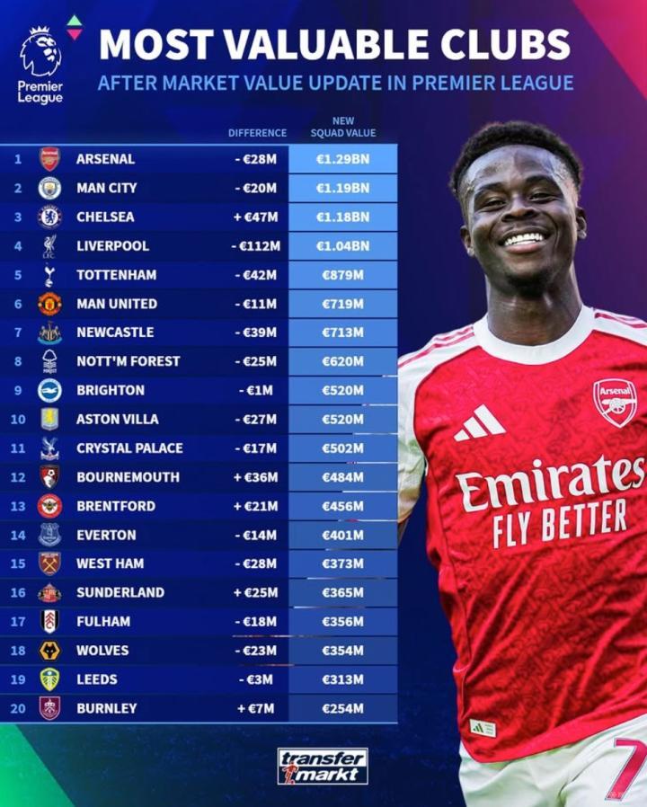 1. 阿森纳 12.9亿欧元(-2800万欧元)
