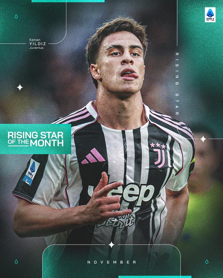 北京时间12月10日,意甲官方宣布,尤文图斯前锋凯南-伊尔迪兹当选联赛11月最佳新星。