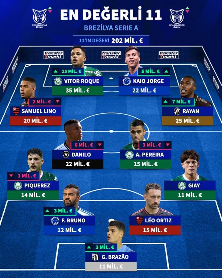 北京时间12月11日,在更新了巴甲球员的身价之后,德转还列出了目前巴甲最贵的11人阵容,身价3500万欧元的维托尔-罗克领衔,阵容还包括了尤文图斯旧将凯奥-若热、马德里竞技旧将利诺、曼联旧将安德烈亚斯-佩雷拉以及国际米兰旧将布拉藏。