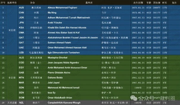 本期培训名单来自亚洲足联、非洲足联和大洋洲足联,有19个协会共20名裁判员参加,其中包括亚足联9个协会的10名裁判员、非足联9个协会的9名裁判员、大洋足联1个协会的1名裁判员。