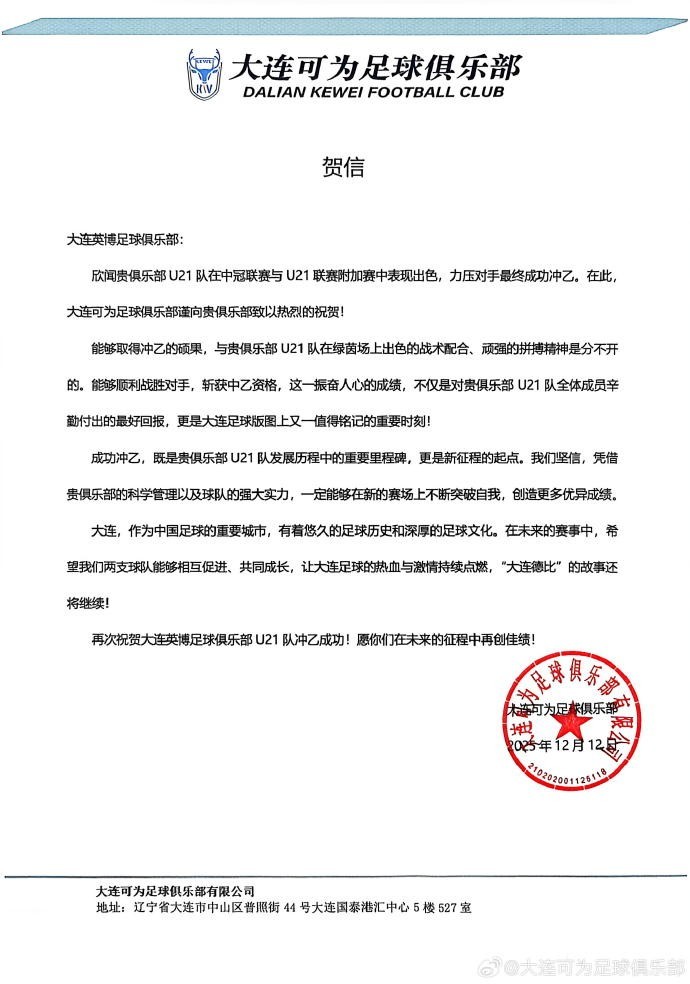 欣闻贵俱乐部U21队在中冠联赛与U21联赛附加赛中表现出色,力压对手最终成功冲乙。在此,大连可为足球俱乐部谨向贵俱乐部致以热烈的祝贺!