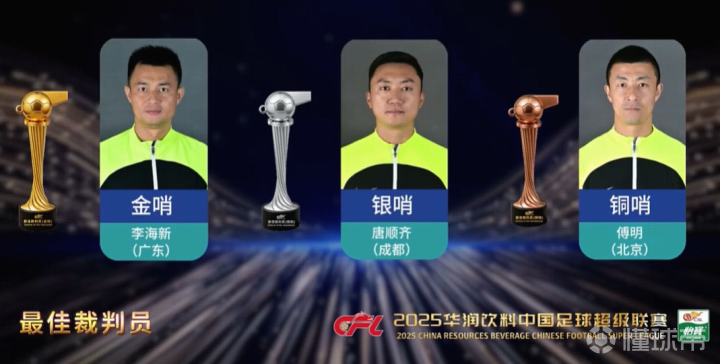 中超联赛:金哨 李海新(广东)、银哨 唐顺齐(成都)、铜哨 傅明(北京)