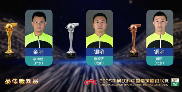 北京时间12月12日,2025赛季中国足球职业联赛颁奖会在上海进行。目前,裁判相关奖项已经公布。其中,李海新当选2025赛季中超金哨,唐顺齐当选银哨,傅明当选铜哨。