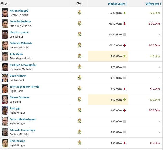 北京时间12月12日,德转市场更新西甲球员身价,皇马队内姆巴佩较上期上升2000万欧,目前身价2亿欧,贝林厄姆下降2000万欧至1.6亿欧。