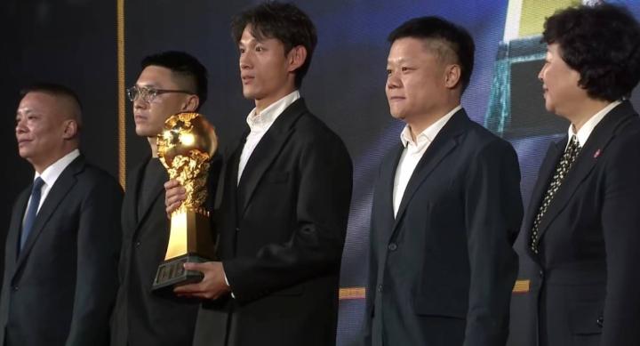 北京时间12月12日,2025赛季中国足球职业联赛颁奖会在上海进行,大会尾声,王燊超代表实现三连冠的上海海港捧起火神杯。