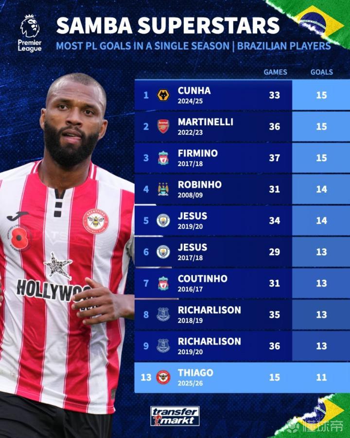 北京时间12月13日,德转列出了巴西球员英超单赛季进球数TOP10,马特乌斯-库尼亚、马丁内利以及菲尔米诺15球并列第一,本赛季英超前15轮就打进11球的伊戈尔-蒂亚戈位列第13位。