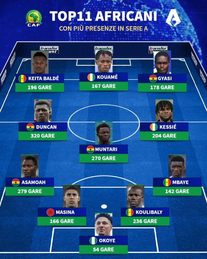 易卜拉希马-姆巴耶(塞内加尔)142场、库利巴利(塞内加尔)236场、马西纳(摩洛哥)166场、阿萨莫阿(加纳)279场