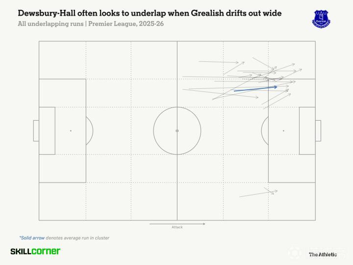 在欧洲五大联赛至少出场10次的中场球员中,只有森林队的埃利奥特-安德森(31次)的“内套插上跑动”次数超过了他的26次。我们可以看到,其中很大一部分是那些从左路内套插入禁区的跑动。其中一半是在格拉利什持球时进行的,显示了两人的配合频率。这有助于埃弗顿成为一支更具创造力和变化多端的进攻力量。