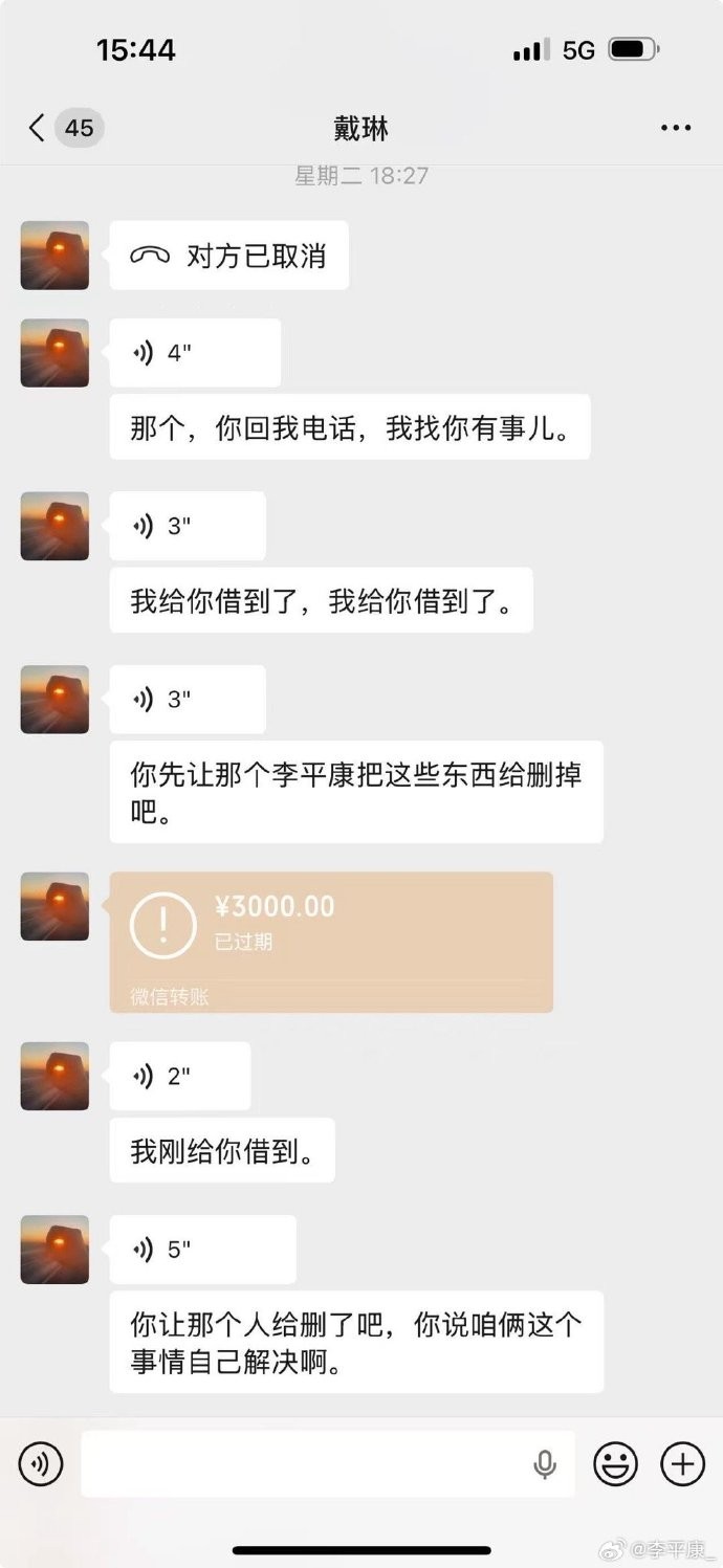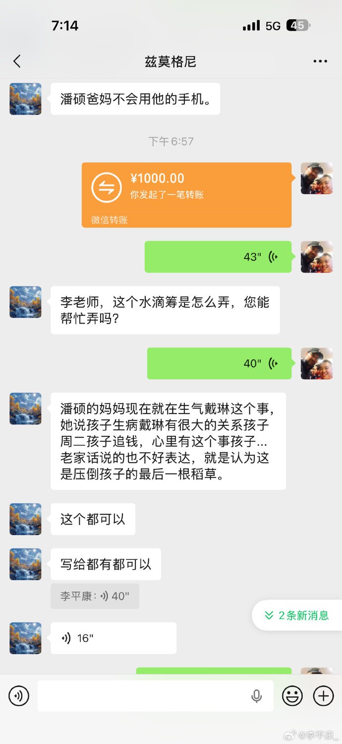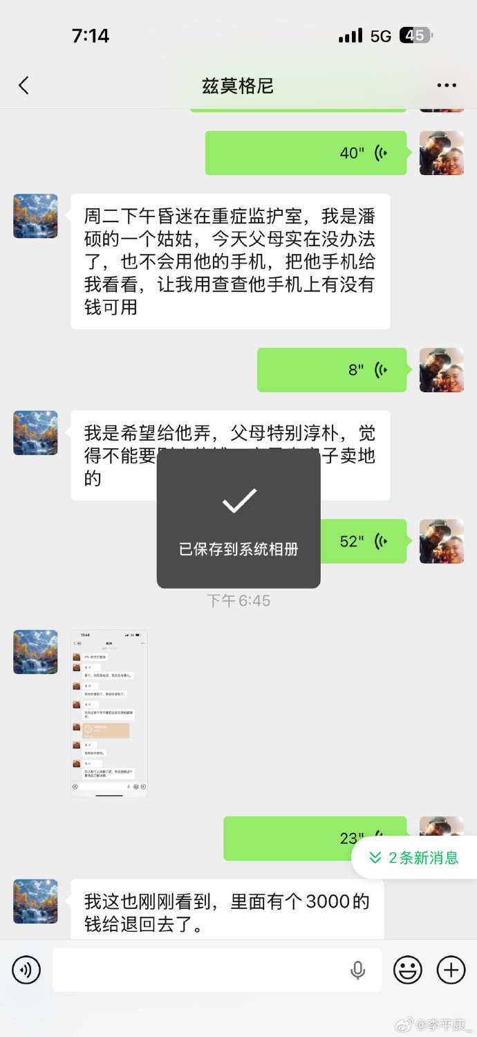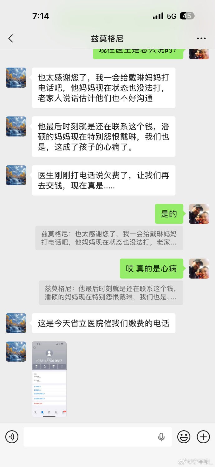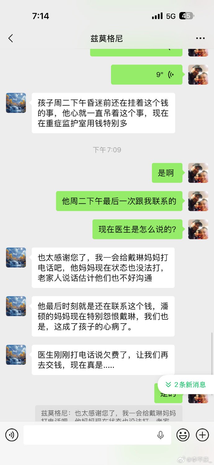 今天他的姑姑受他父母委托,打开他的手机和我取得了联系。小潘目前情况很不乐观,已经昏迷四天,在icu每日花费巨大。而让家人难以释怀的是,昏迷前一刻,小潘还一边和我沟通,一边向戴琳讨债!善良厚道的小潘一直没有把这件事告诉父母,他的家人也是今天打开手机之后才了解到这个情况。