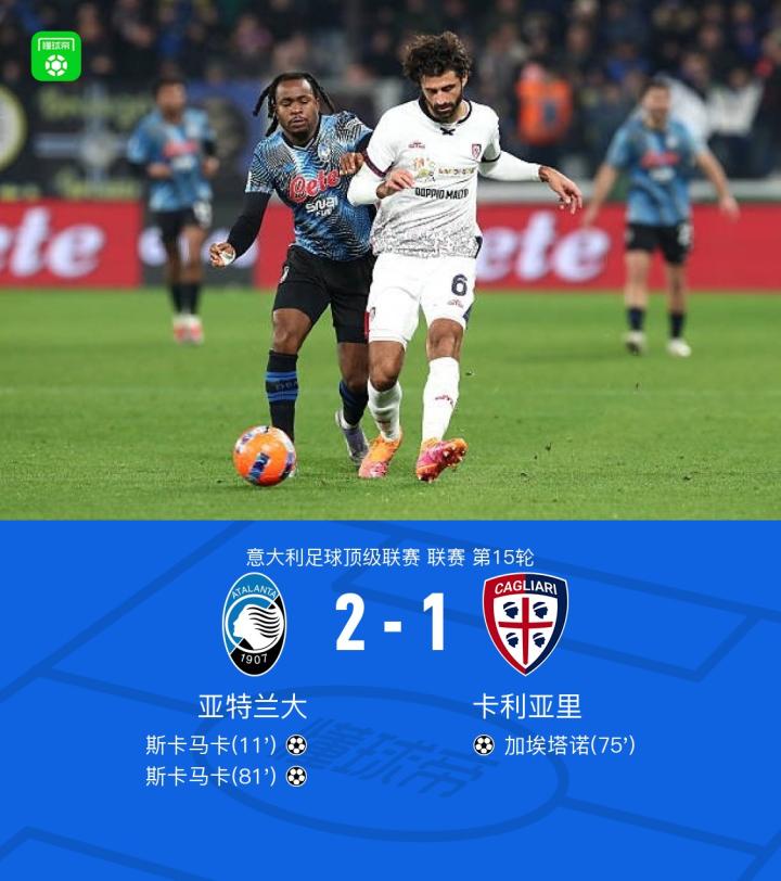 亚特兰大2-1卡利亚里,斯卡马卡双响,加埃塔诺破门
