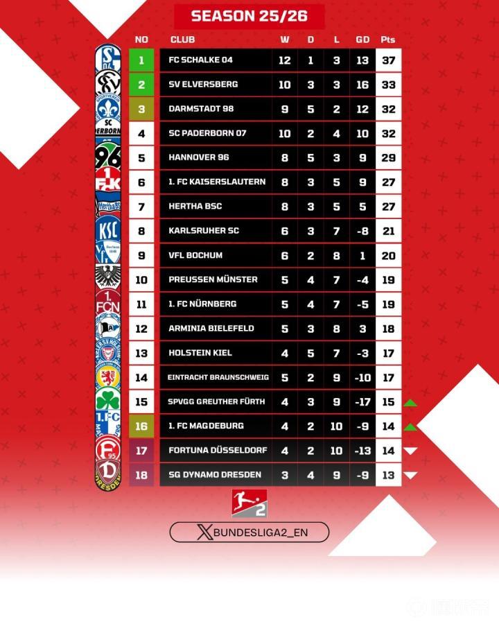 北京时间12月14日晚间,德乙联赛第16轮比赛全部结束,结束本轮德乙后,沙尔克以12胜1平3负的战绩积37分提前一轮夺得德乙半程冠军。