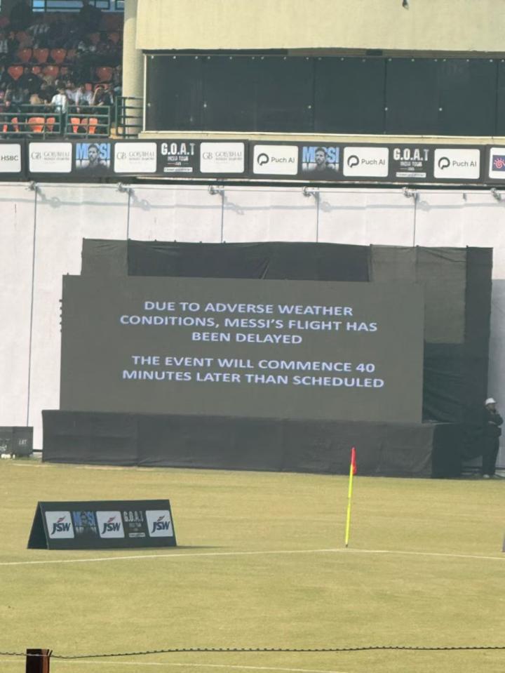 体育场内大屏幕写道:“因天气状况恶劣,梅西所乘航班已延误,本场活动将比原定时间推迟40分钟举行。”