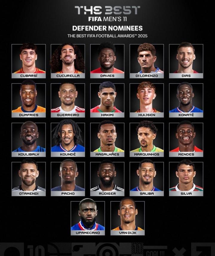 库巴西、库库雷利亚、阿方索-戴维斯、迪洛伦佐、鲁本-迪亚斯、邓弗里斯、格雷罗、阿什拉夫、赫伊森、科纳特、库利巴利、孔德、加布里埃尔、马尔基尼奥斯、努诺-门德斯、奥塔门迪、威廉-帕乔、吕迪格、萨利巴、蒂亚戈-席尔瓦、于帕梅卡诺、范戴克