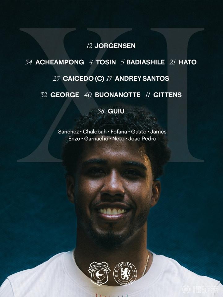切尔西首发:12-约恩森、34-阿昌庞、4-阿达拉比奥尤、5-巴迪亚西勒、21-哈托、25-凯塞多、17-安德雷-桑托斯、32-乔治、40-博纳诺特、11-吉滕斯、38-吉乌