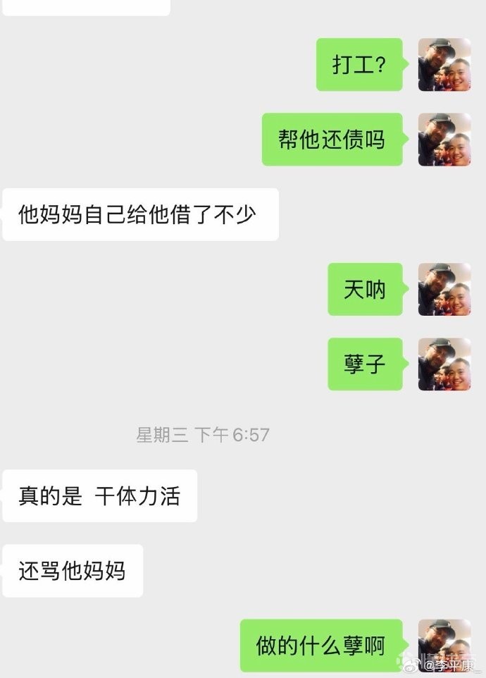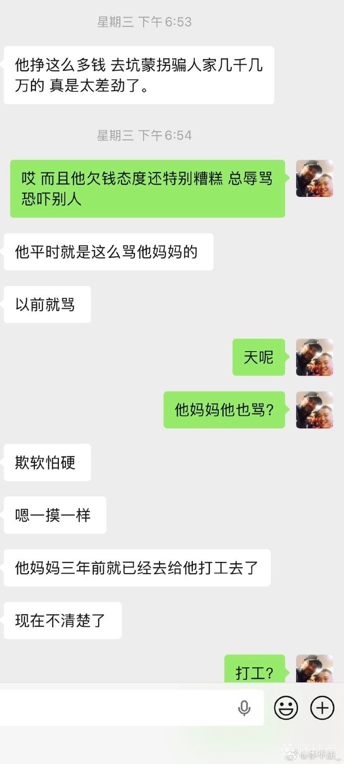 北京时间12月16日,媒体人李平康晒出3张微信聊天截图并表示:“据戴琳曾经身边朋友介绍,戴琳对他的母亲也是经常进行辱骂,戴琳母亲打工干体力活帮儿子还债。”