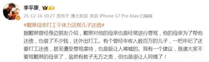 媒体人李平康写道:“据戴琳曾经身边朋友介绍,戴琳对他的母亲也是经常进行辱骂,他的母亲为了帮他还债,也借了不少钱,还外出打工。有个曾经年收入数百万的儿子,一把年纪了还要打工还债,甚至遭受辱骂虐待,也是挺让人唏嘘的。我有一个建议,恳请大家不要骂戴琳的母亲了,虽然有教子无方之责,但也是很让人同情了!”