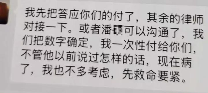 潘某姑姑提供的微信截图显示,15日下午5点戴琳转过来了5000块钱,然后发消息称:“我先把答应你们的付了,其余的律师对接一下。或者潘某可以沟通了,我们把数字确定,我一次性付给你们,不管他以前说过怎样的话,现在病了,我也不多考虑,先救命要紧。”