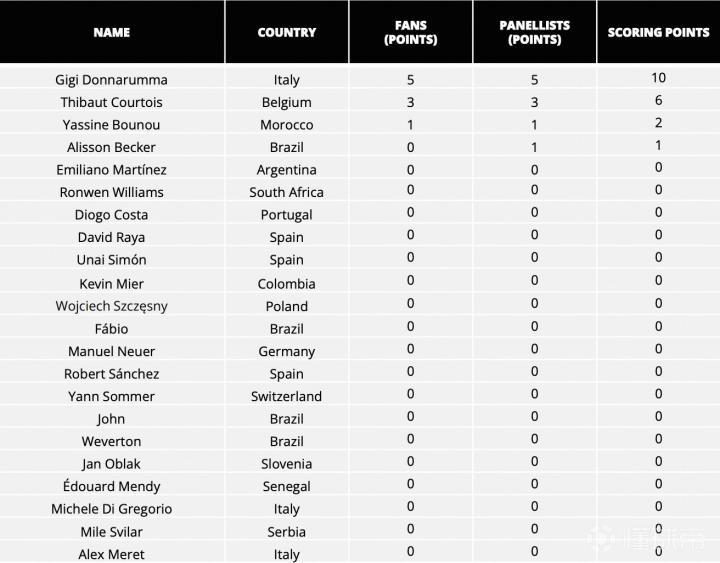 门将位置上投票结果第一名得5分,第二名得3分,第三名得1分,并通过专家投票分和球迷投票分相加得出总分排名,最终当选的是多纳鲁马。