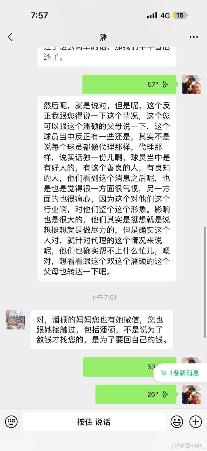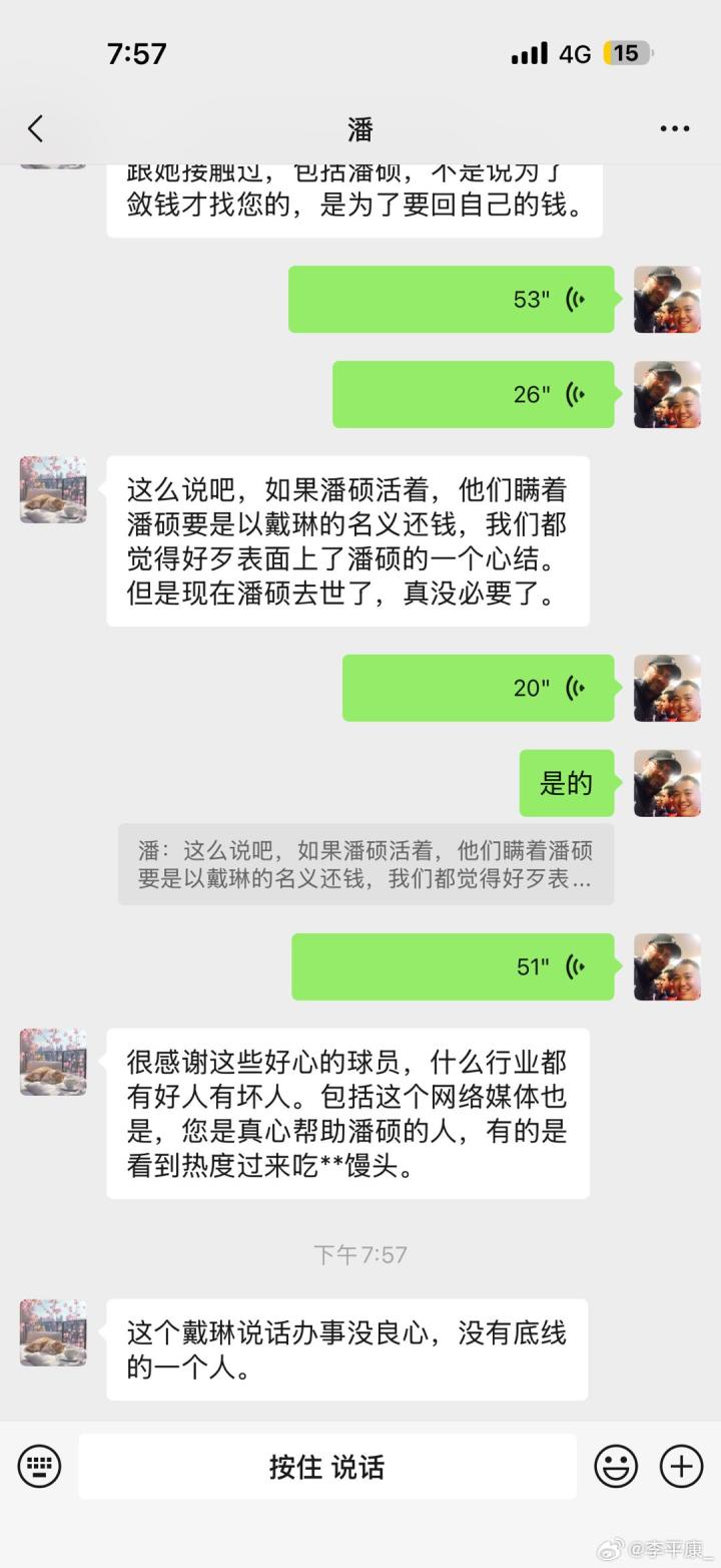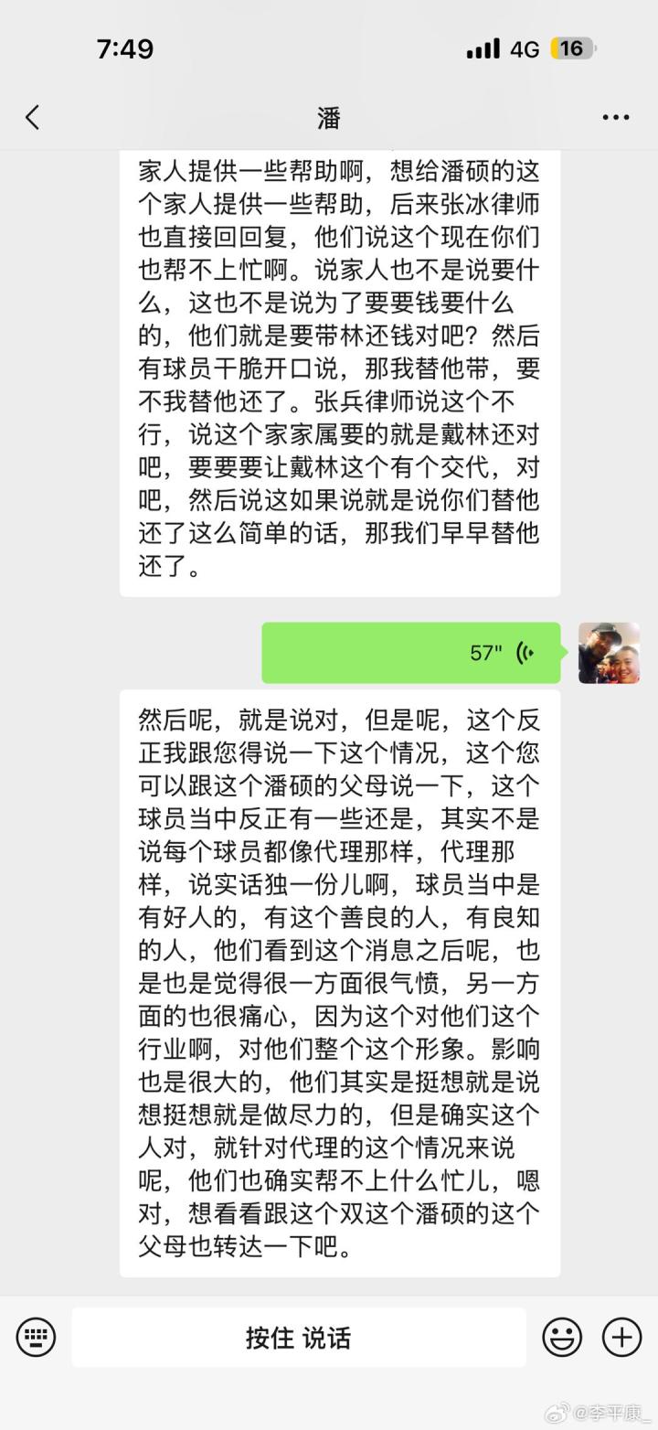 李平康写道:“昨天晚上潘硕去世的消息传出后,有几个球员联系到张冰律师和我,这其中基本都是张律的代理客户,有著名国脚也有自己还被欠薪的小孩。他们询问潘硕家人目前的需要,希望能够匿名为潘硕家人提供经济上的帮助,我们也解释了由于潘硕已经离世,潘家人并不想要捐款,只想要戴琳还钱,在这点上他们确实帮不上忙。还有球员说戴琳差多少钱他来还,这个张律也解释了,冤有头债有主,人家需要的是戴琳还,如果谁还都行我们早就补上了!在这里讲出这个事一方面是想说潘家并没有想借舆论来争取利益的想法,他们只想讨个公道给潘硕一个交代。另一方面就是这件事本身给中国的球员群体带来了巨大的负面影响,各个社媒充斥着针对整个球员群体的批判。但事实上每个领域都有好人坏人,中国足球圈也存在很多的正能量!”