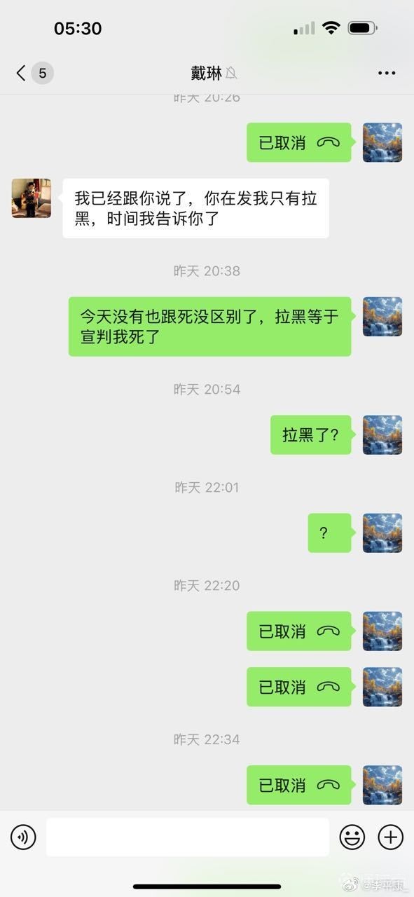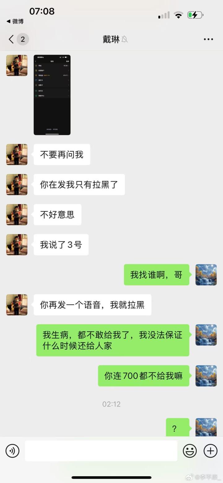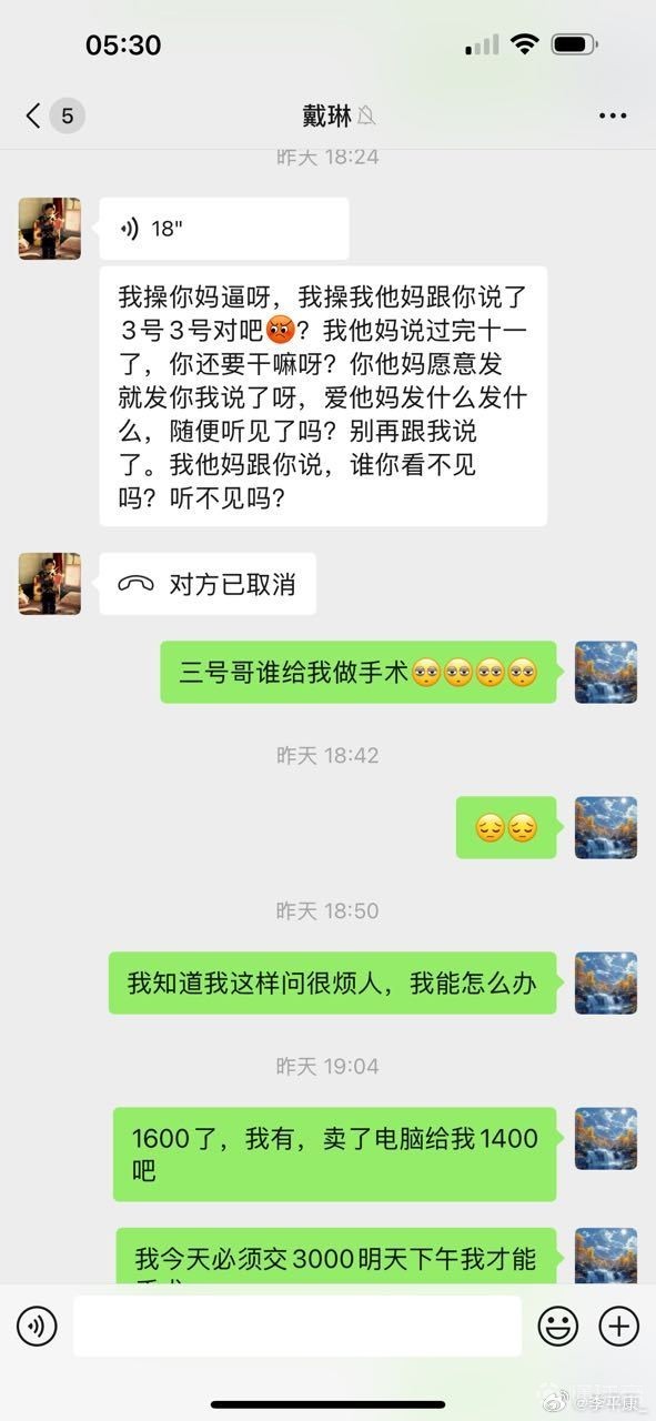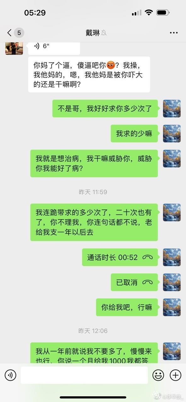 李平康还分享了多张潘硕与戴琳的微信聊天记录截图,疑似为潘硕生前提供,通过截图可以看出,在潘硕患病找戴琳要钱时,戴琳一直对潘硕进行辱骂,还曾表示潘硕是他孙子,并表示自己吃软不吃硬,要求潘硕和他好好说话,并多次威胁潘硕如果再打电话就把他拉黑。