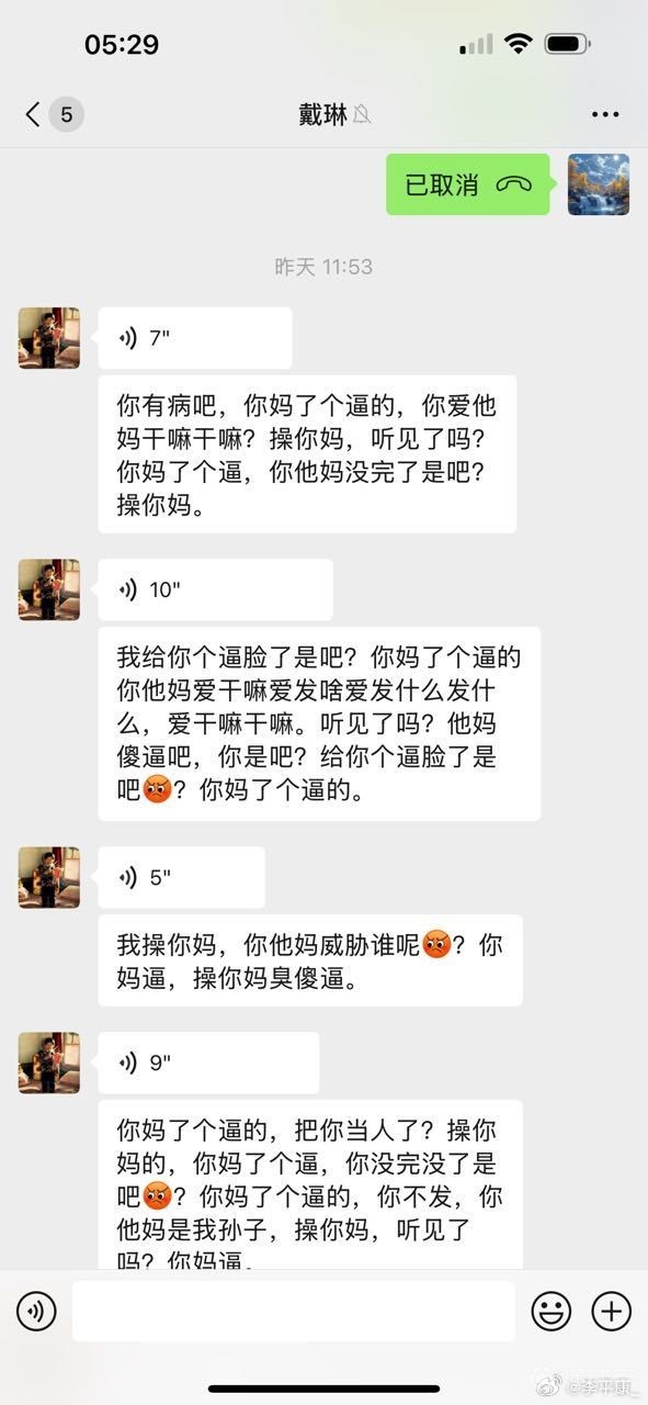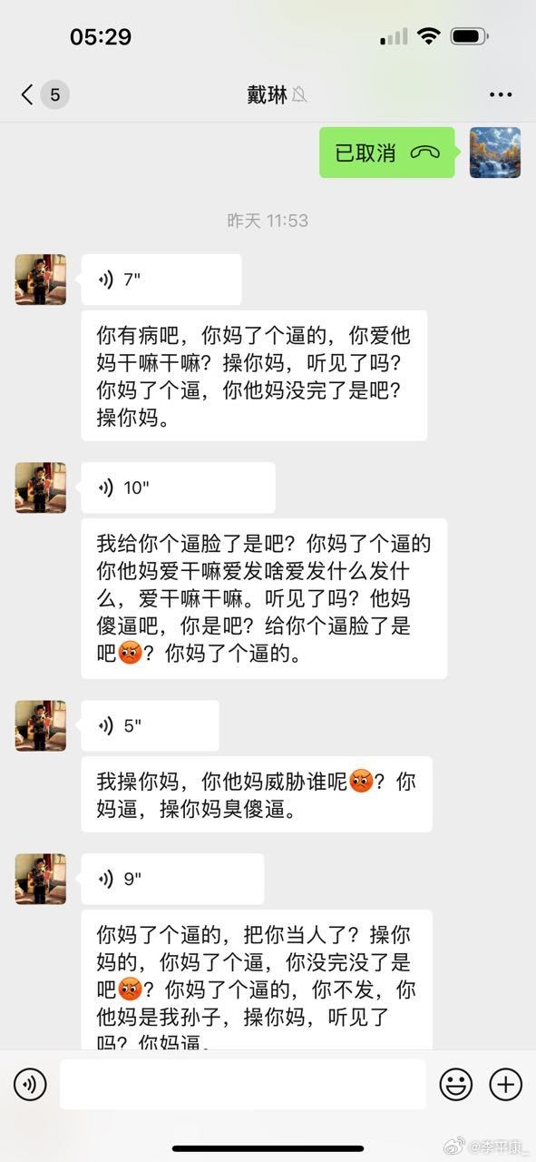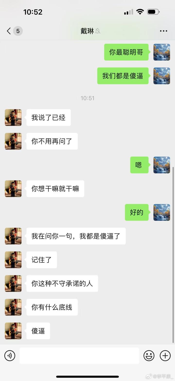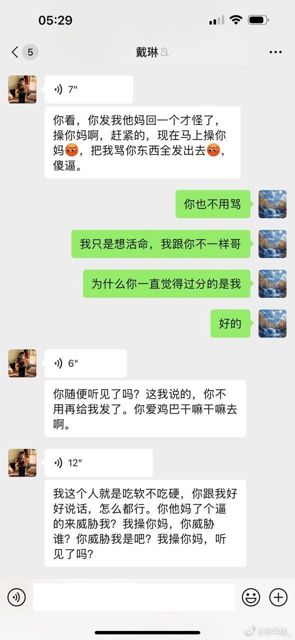 李平康还分享了多张潘硕与戴琳的微信聊天记录截图,疑似为潘硕生前提供,通过截图可以看出,在潘硕患病找戴琳要钱时,戴琳一直对潘硕进行辱骂,还曾表示潘硕是他孙子,并表示自己吃软不吃硬,要求潘硕和他好好说话,并多次威胁潘硕如果再打电话就把他拉黑。