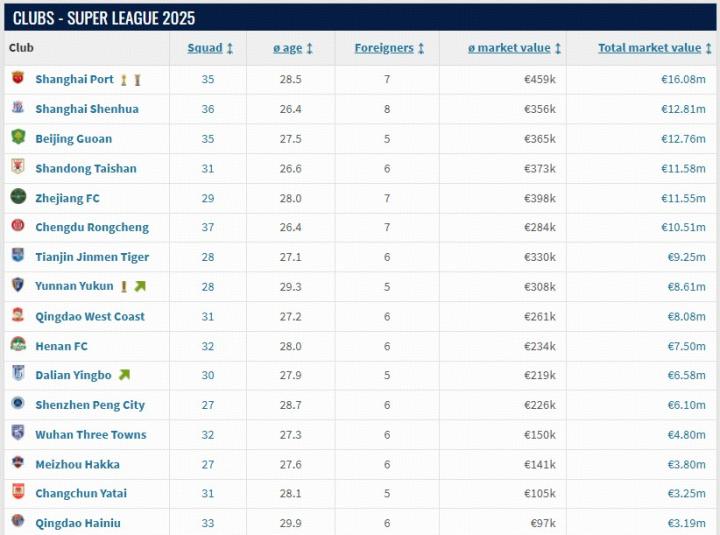 北京时间12月17日,转会市场网更新了中超球员身价,中超球队的身价更新也随之出炉。