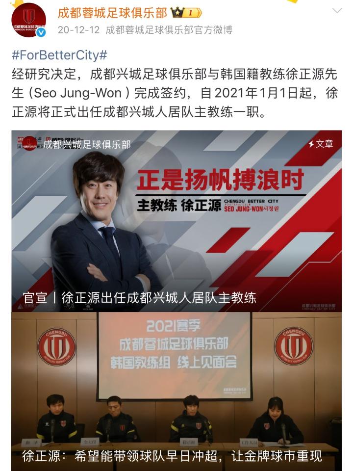【官方:徐正源不再担任成都蓉城主教练】