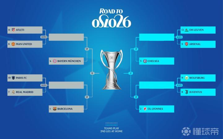 2025-26赛季女足欧冠淘汰赛抽签结束,8支参加淘汰赛附加赛的球队对阵产生,四支直接出线的球队也对应落位。皇马女足若能晋级将在1/4决赛对阵巴萨女足,阿森纳女足若晋级将在1/4决赛对阵切尔西女足。