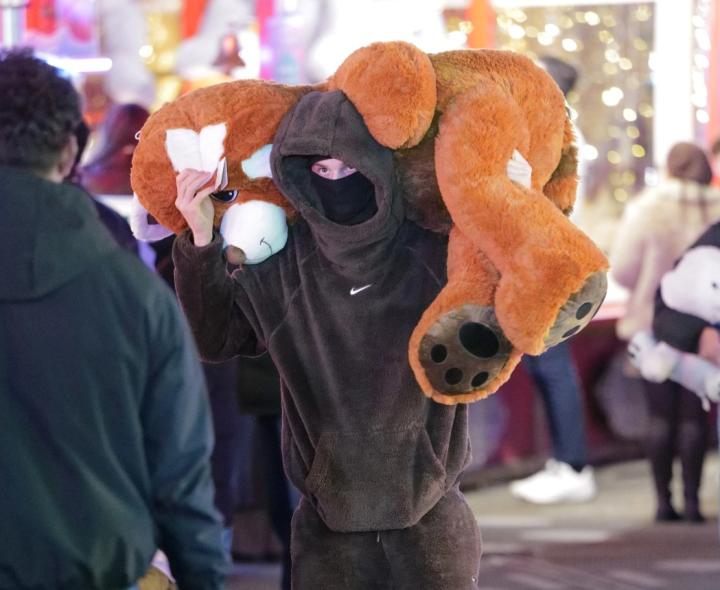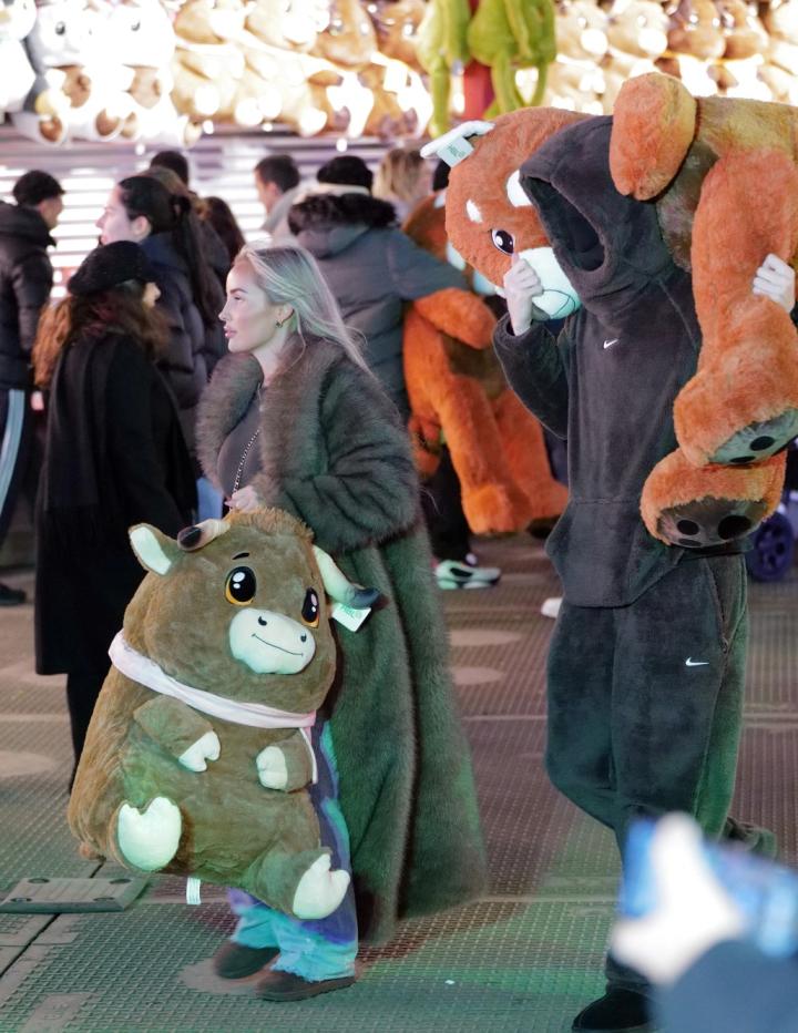 帕尔默在乐园里玩得不亦乐乎,还为金发美女奥利维亚-霍尔德赢了两只超大号毛绒熊玩偶。