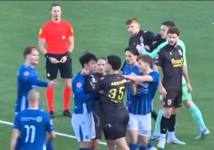 比赛第85分钟,王博豪在禁区前和对手争抢,裁判吹了王博豪犯规。但在裁判吹哨后,王博豪依旧把球射入对方球门。这个举动引发了维特斯队的不满,35号阿舒伊塔尔上来就拽住了王博豪的衣领。邓伯什其他球员见状,赶紧上前为王博豪出头,把对手拉开,而后双方再度产生冲突。