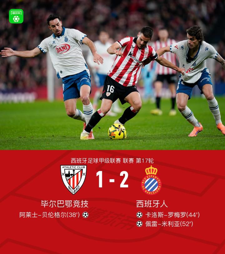 西班牙人2-1逆转毕尔巴鄂竞技,罗梅罗破门,米利亚建功