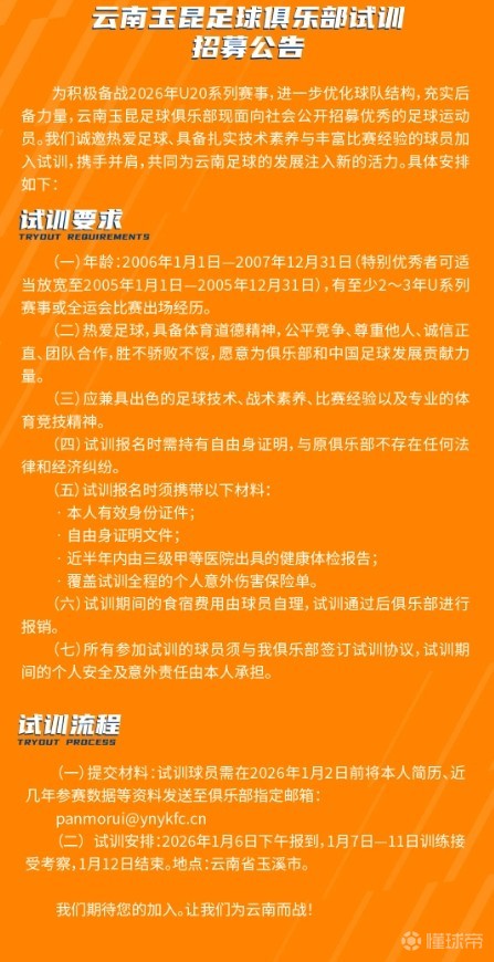 北京时间12月23日,云南玉昆足球俱乐部官方发布试训招募公告——为积极备战2026年U20系列赛事,进一步优化球队结构,充实后备力量,云南玉昆现面向社会公开招募优秀的足球运动员。