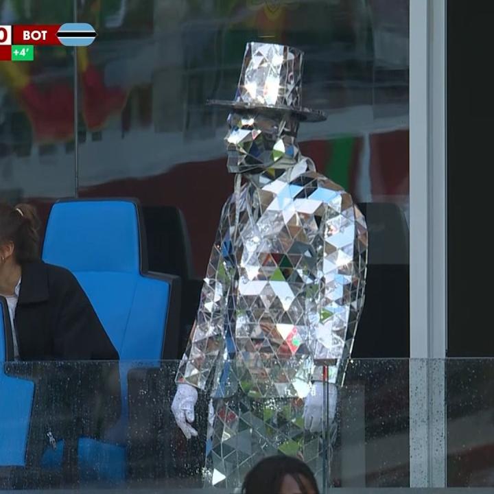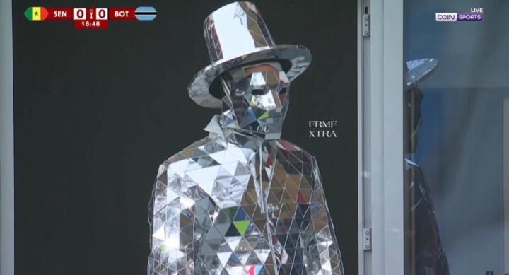 在塞内加尔对阵博茨瓦纳的比赛中,第18分钟,转播镜头捕捉到了看台上一名装扮奇特的球迷:他全身覆盖着菱形镜面碎片,从礼帽到衣着宛如一个“行走的反光镜”,不断折射着周围的景象。